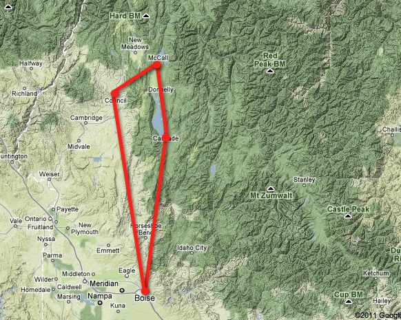 So, the plan is to fly to Horseshoe Bend, follow the highway to Cascade (U70), follow Cascade reservoir to McCall (MYL), walk into town to have dinner, head West and follow the opposite side of the Council mountain range to Council (U82), then continue South past Emmet and back into Boise before it gets dark.
